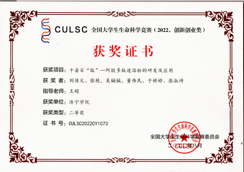 近日,皇冠welcome登录官网“1718大学生创新创业团队”申报的“千姿百肽—阿胶多肽速溶粉的研发及应用”项目在全国大学生生命科学竞赛(2022,创新创业类)中获得全国二等奖。