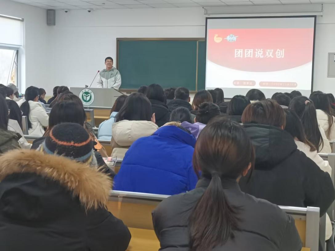11月30日,皇冠welcome登录官网团委在9号楼C305举办“团团说双创”活动。活动由院团委书记刘学文主讲,近100名学生代表参加。